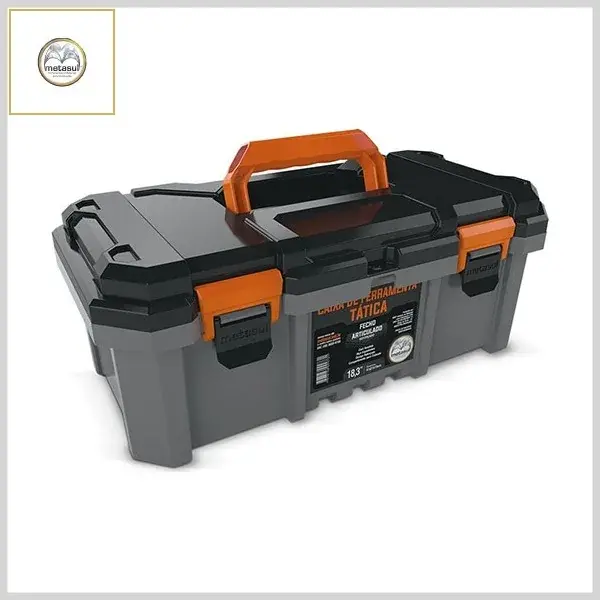 Produto confeccionado em plástico polipropileno com corpo na cor cinza, alça na cor laranja e tampa na cor preta, com fecho de metal. Indicado para a guarda de utensílios ou ferramentas manuais de elétrica, hidráulica, marcenaria e mecânica, entre outras.