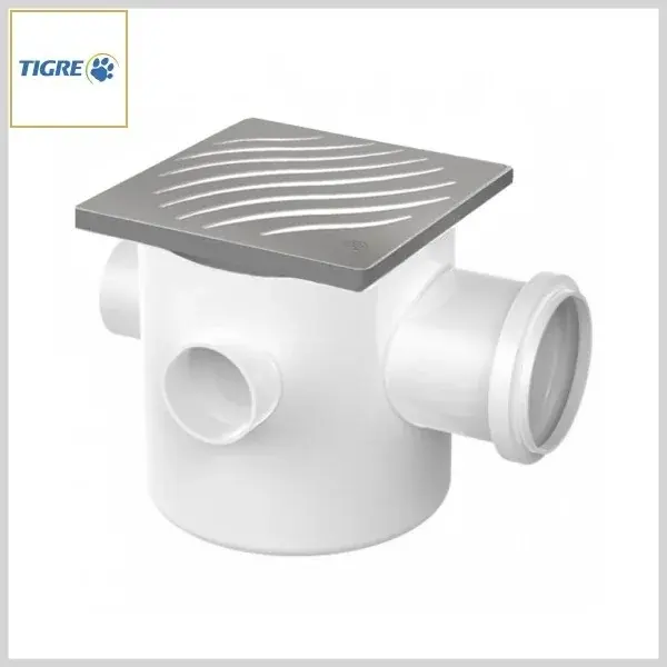 Caixa Sifonada (3 Entradas) 100mm c/Pta.Grelha+Grelha Quadrada Inox - Diâmetro: 100 x 100(Altura) x 50 mm - Tigre