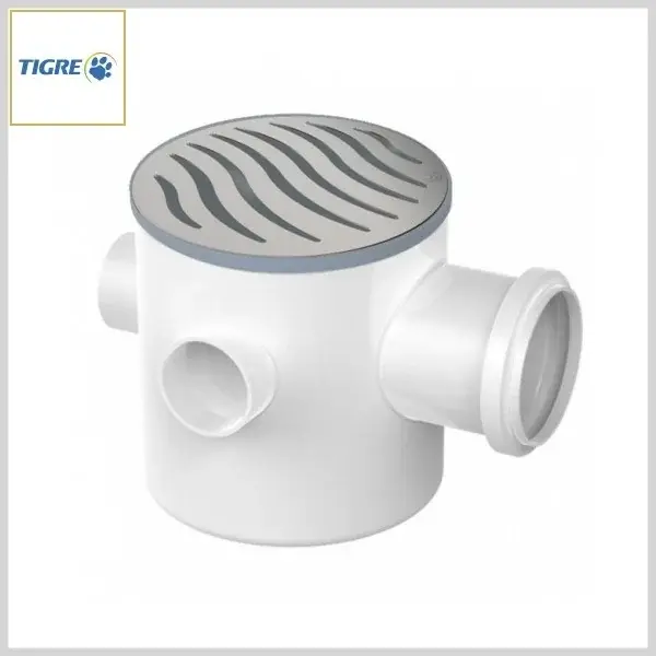 Caixa Sifonada (3 Entradas) 100mm c/Pta.Grelha+Grelha Redonda Inox - Diâmetro: 100 x 100(Altura) x 50 mm - Tigre