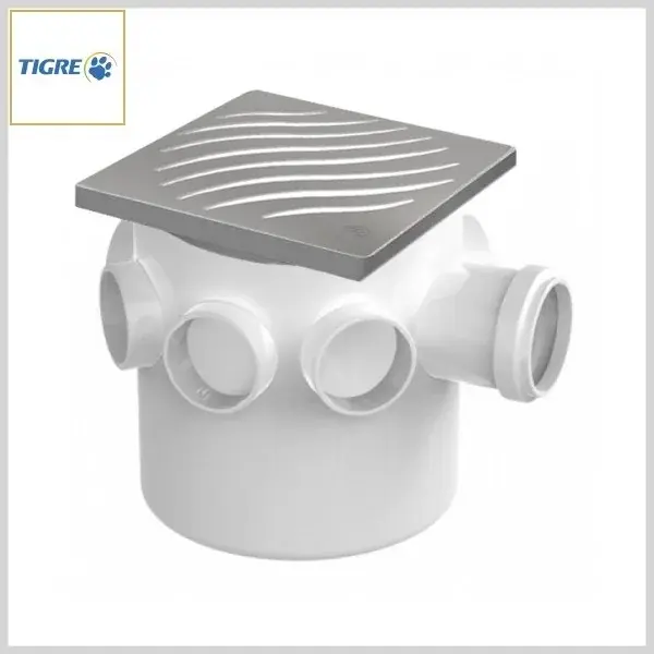 Caixa Sifonada (7 Entradas) 150mm c/Pta.Grelha+Grelha Quadrada Inox - Diâmetro: 150 x 150(Altura) x 50 mm - Tigre