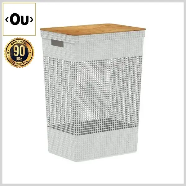 Cesto Organizador Grid Retangular Plástico Polipropileno c/Tampa de Bambu, 49.0 litros - Branco Oceano - Ou