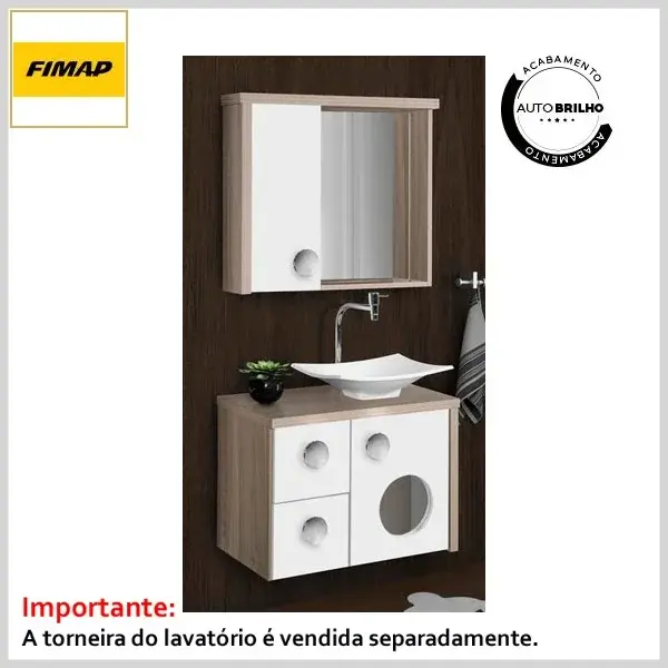 Cjto Toucador+Espelheira 060 c/Tampo+Cuba Wood Maple e Branco - 645 x 480 x 382mm - Fimap