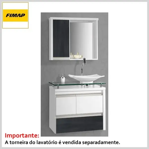 Cjto Toucador+Espelheira 060 c/Vidro+Cuba Arezzo-Thot Branco e Ébano - 650 x 595 x 385mm - Fimap