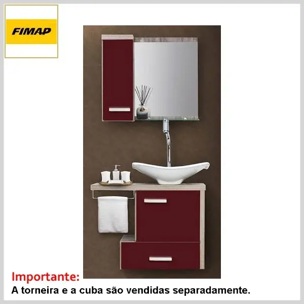 Cjto Toucador+Espelheira 065 c/Tampo Viena-Turin Maple e Bordô - 645 x 480 x 382mm - Fimap