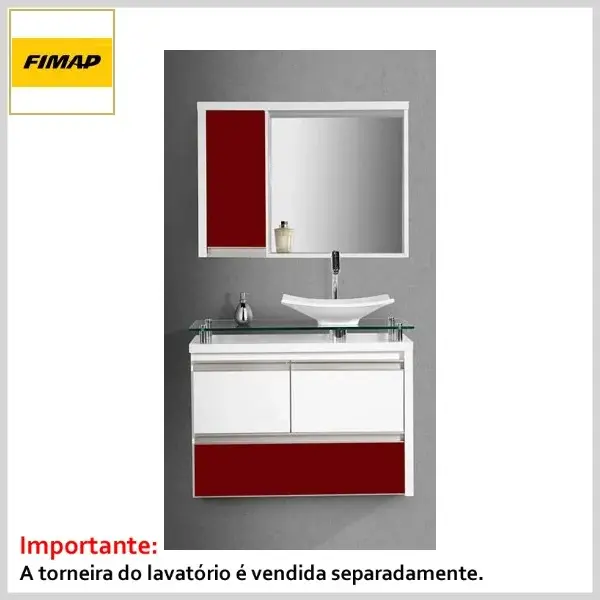 Cjto Toucador+Espelheira 080 c/Vidro+Cuba Arezzo-Thot Branco e Bordô - 785 x 595 x 385mm - Fimap
