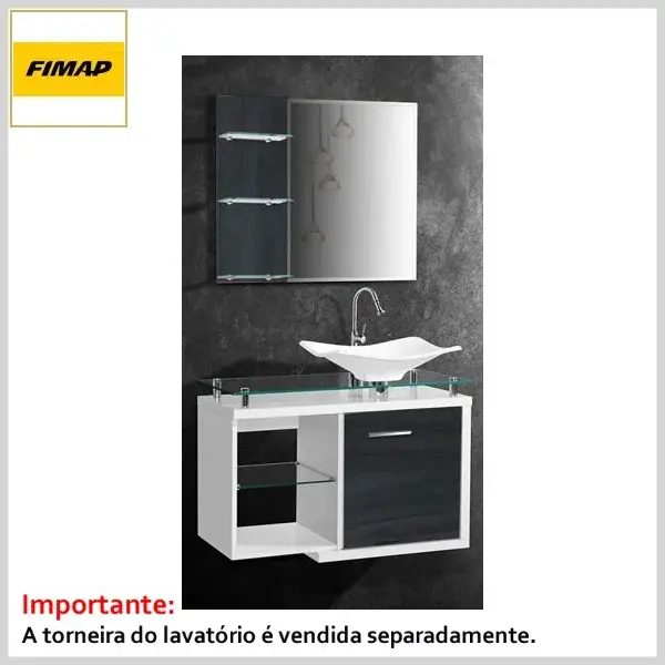 Cjto Toucador+Espelheira 080 c/Vidro+Cuba Dama-City Branco e Ébano - 800 x 565 x 385mm - Fimap
