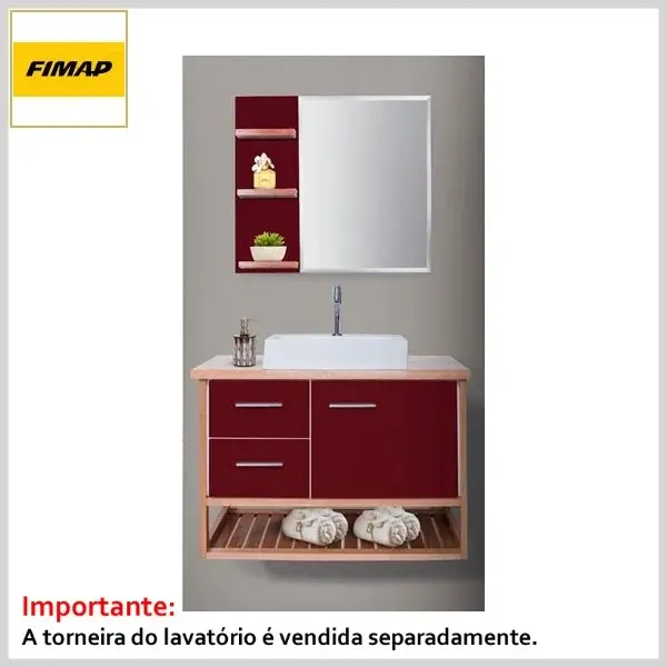Cjto Toucador+Espelheira 085 c/Tampo+Cuba Pretty-Brio Madeira e Bordô - 840 x 590 x 445mm - Fimap