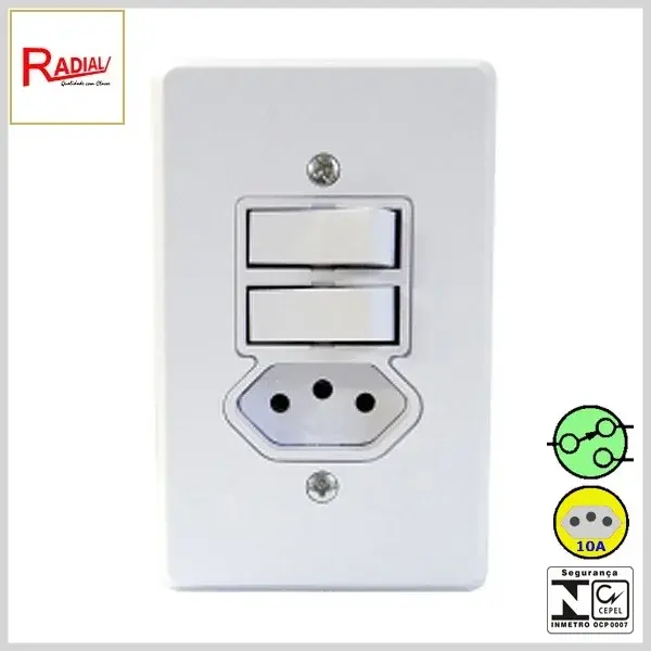 Produto confeccionado em plástico de engenharia, para operação embutida em caixas de luz, sendo indicado para comando de iluminação e alimentação de equipamentos elétricos de baixa potência através da tomada incorporada. Permite operar em tensões de até 250Volts e com correntes máximas de 10Amperes (disponível também com tomadas em 20A).