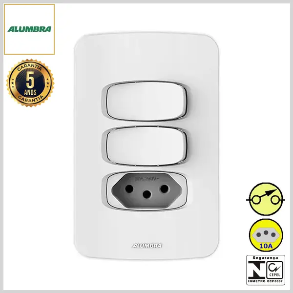 Conjunto de Embutir 4x2 Gracia 2 Interruptores Simples +1 Tom 2P+Terra - 10 Amp x 250 Volts - Alumbra