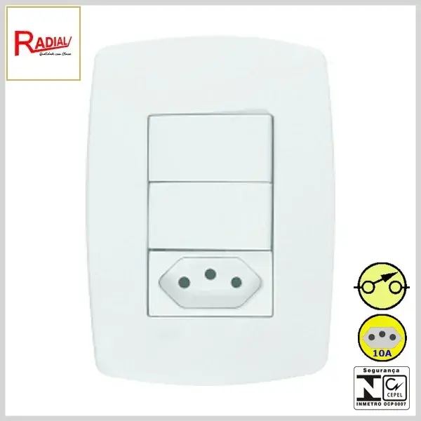 Produto confeccionado em plástico de engenharia, para operação embutida em caixas de luz, sendo indicado para comando de iluminação e alimentação de equipamentos elétricos de baixa potência através da tomada incorporada. Permite operar em tensões de até 250Volts e com correntes máximas de 10Amperes (disponível também com tomadas em 20A).
