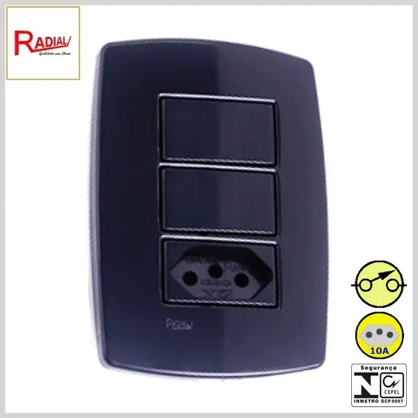 Produto confeccionado em plástico de engenharia, para operação embutida em caixas de luz, sendo indicado para comando de iluminação e alimentação de equipamentos elétricos de baixa potência através da tomada incorporada. Permite operar em tensões de até 250Volts e com correntes máximas de 10Amperes (disponível também com tomadas em 20A).
