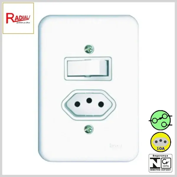 Produto confeccionado em plástico de engenharia, para operação embutida em caixas de luz, sendo indicado para comando de iluminação e alimentação de equipamentos elétricos de baixa potência através da tomada incorporada. Permite operar em tensões de até 250Volts e com correntes máximas de 10Amperes (disponível também com tomadas em 20A).