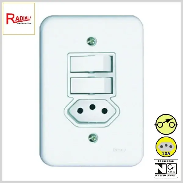 Produto confeccionado em plástico de engenharia, para operação embutida em caixas de luz, sendo indicado para comando de iluminação e alimentação de equipamentos elétricos de baixa potência através da tomada incorporada. Permite operar em tensões de até 250Volts e com correntes máximas de 10Amperes (disponível também com tomadas em 20A).