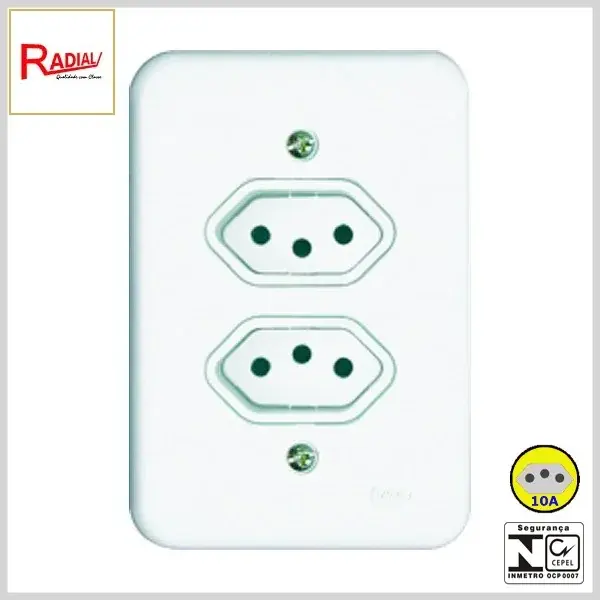 Produto confeccionado em plástico de engenharia, para operação embutida em caixas de luz, sendo indicado para alimentação de equipamentos elétricos de baixa potência. Permite operar em tensões de até 250Volts e com correntes máximas de 10Amperes (disponível também para correntes de até 20A).