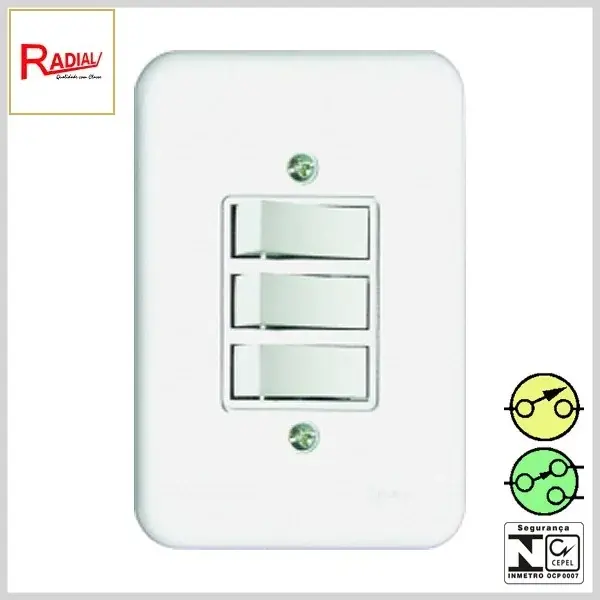 Produto confeccionado em plástico de engenharia, sendo indicado para comando de iluminação, embutido em caixas de luz. Permite operar em tensões de até 250Volts e com correntes máximas de até 10Amperes.