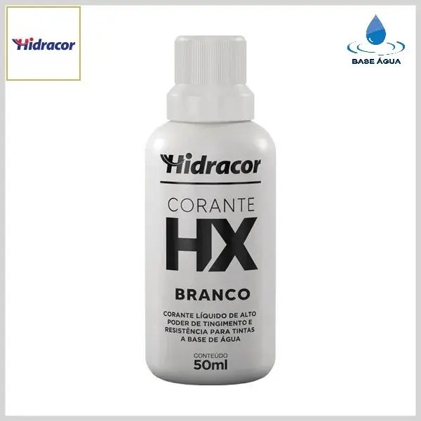 Corante Líquido Hx da Hydracor é um pigmento corante de alto poder de tingimento e excelente resistência às intempéries, sendo indicado para colorir tintas látex e acrílicas a base de água ou tintas em pó a base de cal. Disponibilizado em frascos plásticos de 50ml, é produzido em 10 cores diferentes, possibilitando a obtenção de diversas tonalidades. Para cada galão de tinta (3.6L) poderá ser adicionado no máximo 1 frasco do corante (50ml), mantendo-se a proporção para as demais embalagens.