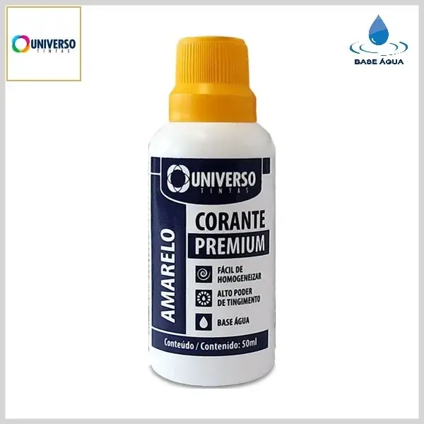 Corante Líquido Universo é um produto a base de água, fácil de homogeneizar e com alto poder de tingimento. É indicado para tingimento de tintas látex, acrílicas e esmaltes a base de água. Disponibilizado em frascos plásticos de 50ml, é produzido em 9 cores diferentes, possibilitando a obtenção das mais diversas tonalidades de cores. Para cada galão de tinta (3.6L) poderá ser adicionado no máximo 1 frasco do corante (50ml) até atingir a cor desejada, mantendo-se a proporção para as demais embalagens.