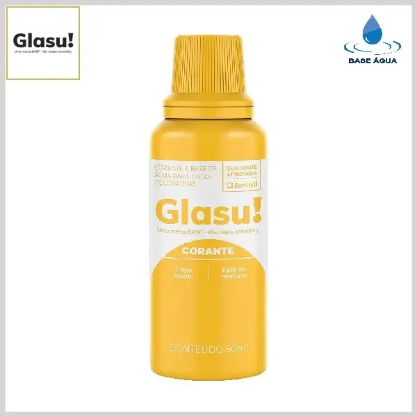 Corante Líquido Glasu! é especialmente formulado para o tingimento de tintas látex ou acrílicas a base de água. É um produto de fácil homogeneização, com alto poder de tingimento e excelente resistência às intempéries e aos raios ultra-violeta. Disponibilizado em frascos plásticos de 50ml, é produzido em 8 cores diferentes, possibilitando a obtenção de diversas tonalidades para cada padrão de cor escolhido. Para cada galão de tinta (3.6L) poderá ser adicionado no máximo 1½ frasco do corante (50ml) até atingir a cor desejada, mantendo-se a proporção para as demais embalagens.
