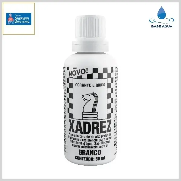 Corante Líquido Xadrez da Sherwin Williams é um produto a base de pigmentos com alto poder de tingimento e de fácil homogeneização. Resistente as intempéries, é indicado para o tingimento de tintas a base de água em geral. Disponibilizado em frascos plásticos de 50ml, é produzido em 9 cores diferentes, possibilitando a obtenção de infinitas combinações para cada padrão de cor escolhido. Para cada galão de tinta (3.6L) poderá ser adicionado no máximo 1 frasco do corante (50ml) até atingir a cor desejada, mantendo-se a proporção para as demais embalagens.