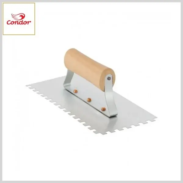 DESEMPENADEIRA CONDOR 854 versão dentada é produzida com cabo de madeira ou plástico e com base de aço cromado. Disponível em 2 tamanhos, é indicada para a aplicação de argamassas colantes para revestimentos cerâmicos e porcelanatos.