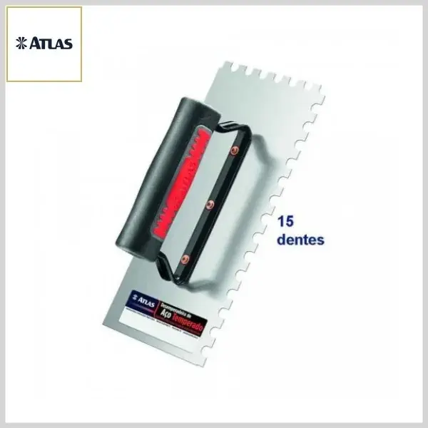 DESEMPENADEIRA DENTADA ATLAS AT145 possui corpo em aço temperado com cabo plástico e 2 hastes de fixação. Disponível no tamanho 257x120x80mm (comprimento x largura x altura) e com dentes 8mm, é ideal para aplicação de argamassa para revestimentos cerâmicos ou cimento.