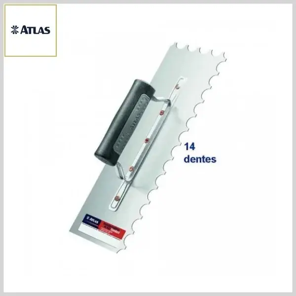 DESEMPENADEIRA DENTADA ATLAS AT236/3 possui corpo em aço standard com cabo plástico e 2 hastes de fixação. Disponível no tamanho 350x120x80mm (comprimento x largura x altura) e com dentes 10mm, é ideal para aplicação de argamassa para revestimentos cerâmicos ou cimento.