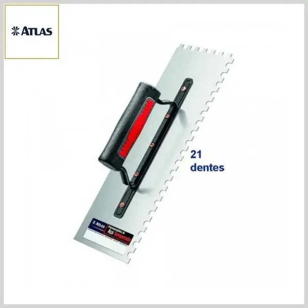 DESEMPENADEIRA DENTADA ATLAS AT245/3 possui corpo em aço temperado com cabo plástico e 2 hastes de fixação. Disponível no tamanho 350x120x80mm (comprimento x largura x altura) e com dentes 8mm, é ideal para aplicação de argamassa para revestimentos cerâmicos ou cimento.