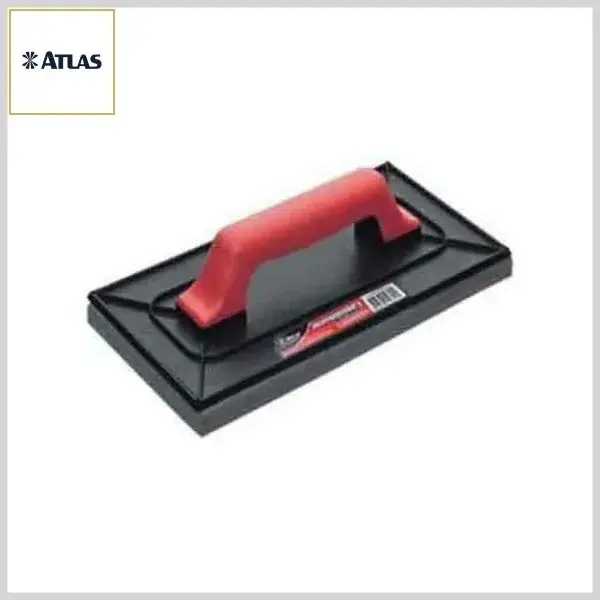 DESEMPENADEIRA PLÁSTICA ATLAS AT167 possui corpo preto e cabo plástico vermelho, com base em espuma. Disponível no tamanho 270x140x90mm (comprimento x largura x altura), é indicada para preparação de rebocos em paredes e tetos.