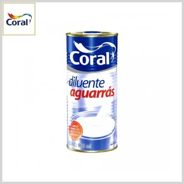 CORAL DILUENTE AGUARRÁS é um solvente incolor, de alta qualidade, indicado para a diluição de fundos para metais, tintas, esmaltes e vernizes sintéticos, a base de resina alquídica. A diluição deve obedecer os critérios e proporções de mistura informados nas embalagens dos produtos que serão diluídos. O produto é inflamável. Ao manusear, evite aproximação com o fogo.