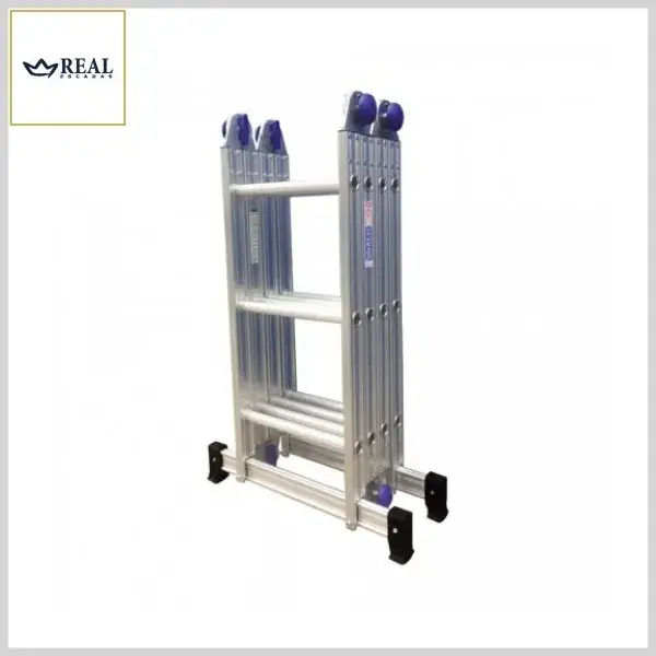 As escadas articuladas da REAL são produzidas em alumínio de liga especial super resistente e são indicadas tanto para uso doméstico como profissional. Os degraus são mais largos, oferecendo maior segurança e ergonomia ao usuário. As sapatas são feitas com material antiderrapante. A escada pode ser utilizada em 13 opções diferentes de montagem com o uso das travas, que possibilitam as mais variadas formas de adaptação aos serviços necessários na obra ou para uso doméstico.