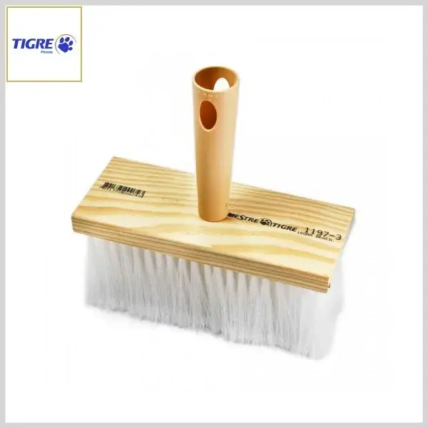 TIGRE ESCOVA (BROXA) 1197 é um produto indicado para pinturas com tintas em pó ou aplicação de impermeabilizantes. Com formato retangular, possui cabo em plástico bege e base em madeira natural, com filamento sintético florado de cor branca.