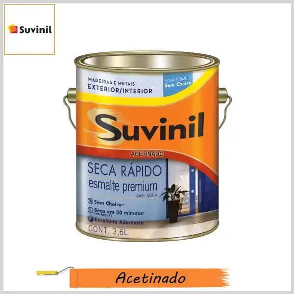 Esmalte Suvinil Base Água Seca Rápido para pintura de multimetais, madeira e alvenaria (repintura) é um produto de secagem rápida, fácil aplicação bom alastramento e aderência. Oferece resistência a fungos, além de não amarelar. É a base de água, oferecendo baixo odor e grande facilidade na limpeza, já que dispensa o uso de aguarrás, também dispensa o uso de fundo em alumínios e galvanizados.