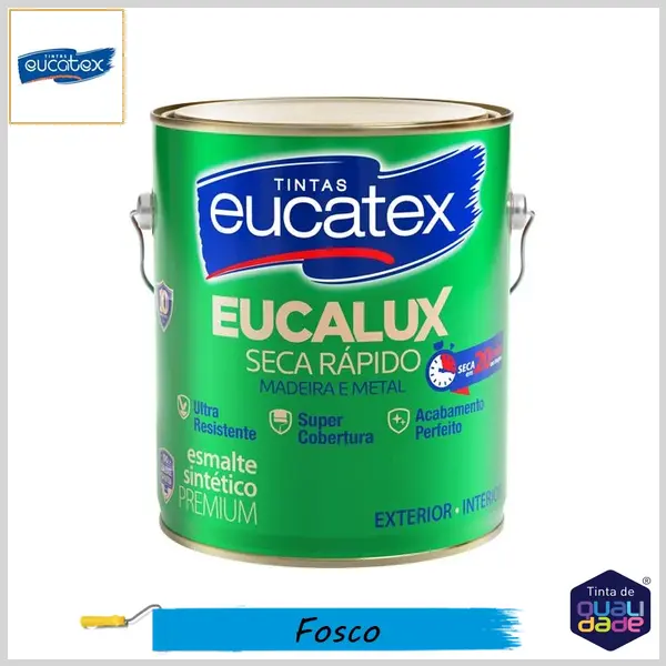 Eucatex Eucalux Seca Rápido Esmalte Premium é indicado para aplicação em superfícies de madeira, metais ferrosos, alumínio, galvanizado e alvenaria. Sua fórmula inovadora permite uma secagem em até 30 min ao toque e ainda possui silicone que cria uma película com proteção prolongada para conservar o brilho e facilitar a limpeza.