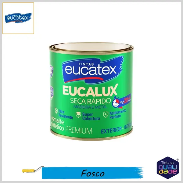Eucatex Eucalux Seca Rápido Esmalte Premium é indicado para aplicação em superfícies de madeira, metais ferrosos, alumínio, galvanizado e alvenaria. Sua fórmula inovadora permite uma secagem em até 30 min ao toque e ainda possui silicone que cria uma película com proteção prolongada para conservar o brilho e facilitar a limpeza.
