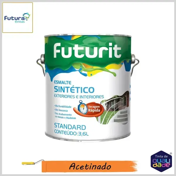 O Esmalte Sintético Futurit Standard é um produto de secagem rápida, fácil aplicação e com resistência fantástica às intempéries, sendo ideal para pinturas e repinturas internas e externas de metais, madeira, galvanizados, alumínio e pvc. O produto está disponível em diversas cores prontas e no Sistema Magia das Cores com mais de 2000 tonalidades, nos acabamentos brilhante, fosco, acetinado e metálico.