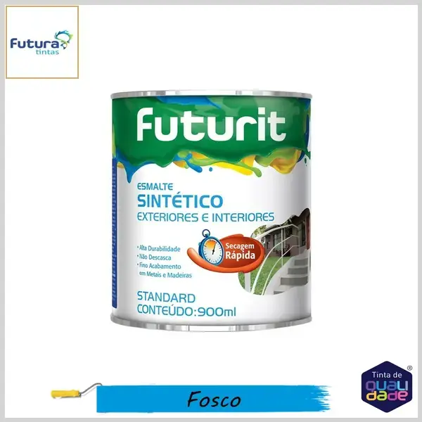 O Esmalte Sintético Futurit Standard é um produto de secagem rápida, fácil aplicação e com resistência fantástica às intempéries, sendo ideal para pinturas e repinturas internas e externas de metais, madeira, galvanizados, alumínio e pvc. O produto está disponível em diversas cores prontas e no Sistema Magia das Cores com mais de 2000 tonalidades, nos acabamentos brilhante, fosco, acetinado e metálico.