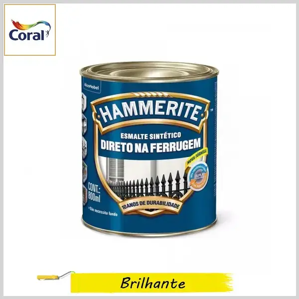 ESMALTE SINTÉTICO CORAL HAMMERITE é um esmalte antioxidante que se aplica diretamente sobre ferro limpo ou enferrujado. Não necessita de fundo prévio, prevenindo e interrompendo o processo de ferrugem sobre os metais. Sua nova fórmula oferece dupla tecnologia, composta por alta repelência à água e ação antocorrosiva. Permite a diluição com aguarrás convencional, eliminando a necessidade de diluição com solvente específico. Possui grande poder de cobertura e rendimento, sendo indicado para ambientes internos e externos.