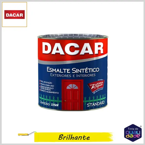 Dacar Esmalte Sintético Standard possui formulação de boa qualidade, garantindo maior proteção e facilidade de limpeza, reduzindo a aderência de sujeira. Proporciona superior acabamento e boa resistência ao intemperismo. Fácil de aplicar, possui alto poder de cobertura e rendimento, além de secagem rápida. É oferecido no acabamento brilhante que destaca com nobreza as características da superfície pintada, com alta durabilidade e proteção. Produto ideal para superfícies externas e internas de metais ferrosos, galvanizados, madeira, cerâmica não vitrificada e alvenaria.