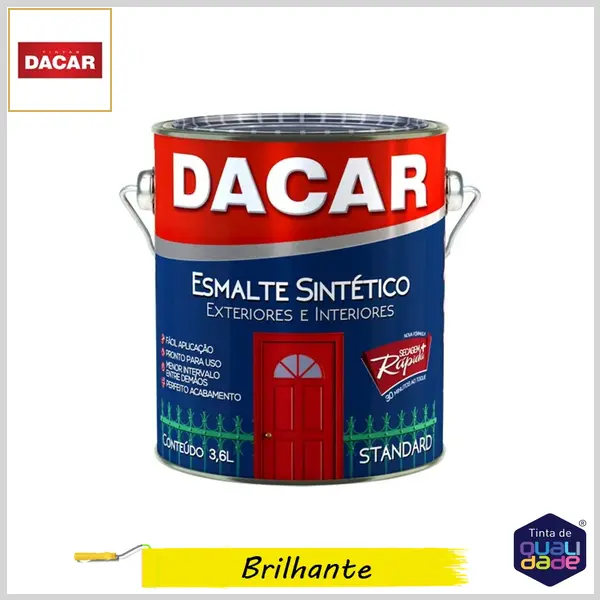 Dacar Esmalte Sintético Standard possui formulação de boa qualidade, garantindo maior proteção e facilidade de limpeza, reduzindo a aderência de sujeira. Proporciona superior acabamento e boa resistência ao intemperismo. Fácil de aplicar, possui alto poder de cobertura e rendimento, além de secagem rápida. É oferecido no acabamento brilhante que destaca com nobreza as características da superfície pintada, com alta durabilidade e proteção. Produto ideal para superfícies externas e internas de metais ferrosos, galvanizados, madeira, cerâmica não vitrificada e alvenaria.