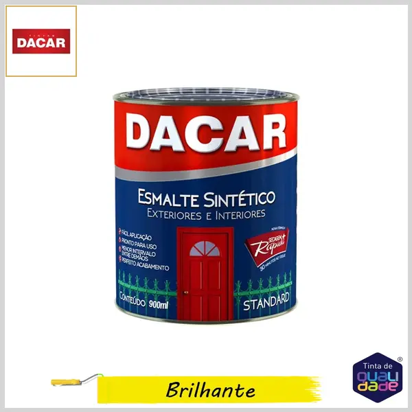 Dacar Esmalte Sintético Standard possui formulação de boa qualidade, garantindo maior proteção e facilidade de limpeza, reduzindo a aderência de sujeira. Proporciona superior acabamento e boa resistência ao intemperismo. Fácil de aplicar, possui alto poder de cobertura e rendimento, além de secagem rápida. É oferecido no acabamento brilhante que destaca com nobreza as características da superfície pintada, com alta durabilidade e proteção. Produto ideal para superfícies externas e internas de metais ferrosos, galvanizados, madeira, cerâmica não vitrificada e alvenaria.