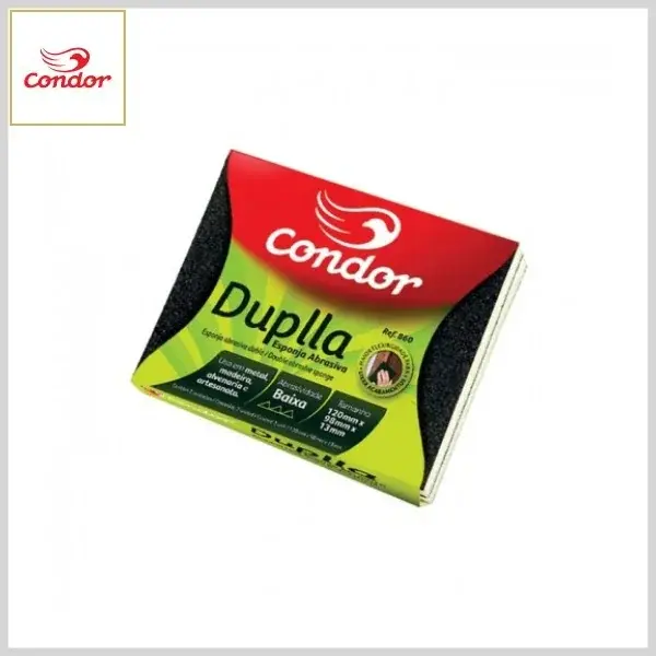 ESPONJA ABRASIVA CONDOR 860 é composta de corpo em espuma de poliéster e face dupla com lâminas de lixas incorporadas. Com 2 opções de abrasividade: 120 (baixa) e 220 (média), é indicada para lixamento de metais, madeira, alvenaria e artesanatos.