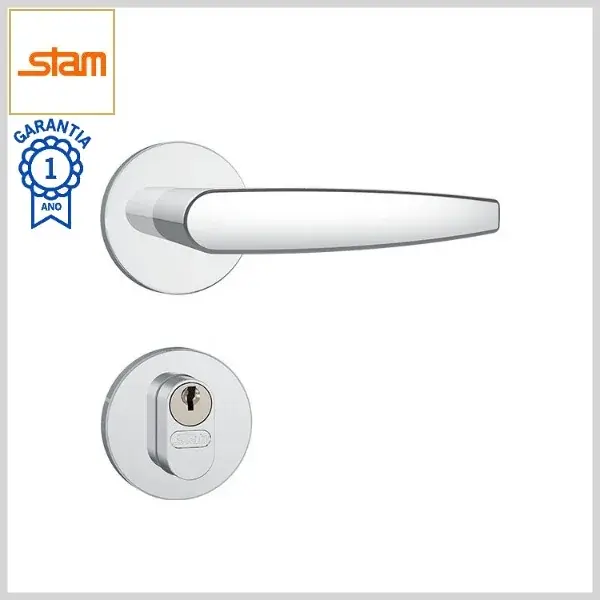 Fechadura Externa Standard 803/33 Broca40mm Chave Simples c/Maçaneta c/Roseta Inox Redonda - Cromado - Stam