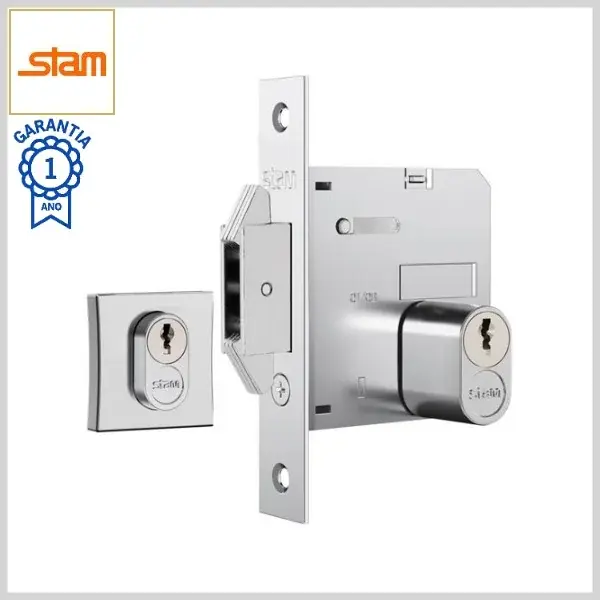 Fechadura Porta Correr Externa Classic 1006 Broca45mm Chave Simples s/Maçaneta c/Roseta Zamac Quadrada - Cromado - Stam