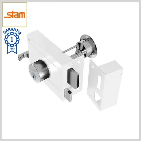 Fechadura Sobrepor Externa p/Portão 701/100P Trinco Reversível Chave Simples c/Corpo+Castanha+Prolongador Aço - Branco - Stam