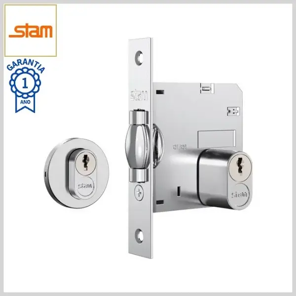 Fechadura Trinco Rolete Externa Classic 1005 Broca45mm Chave Simples s/Maçaneta c/Roseta Inox Redonda - Cromado - Stam