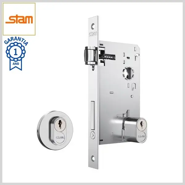 Fechadura Trinco Rolete Externa Classic 1601 Broca55mm Chave Simples s/Maçaneta c/Roseta Inox Redonda - Cromado - Stam