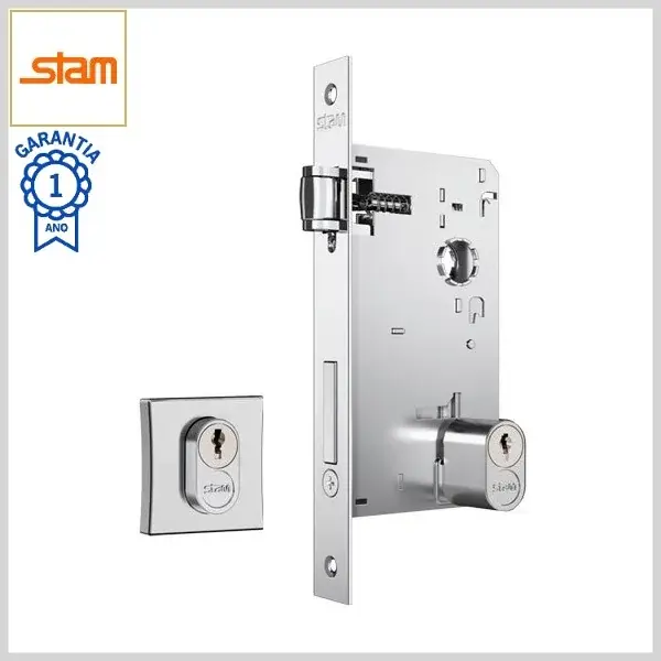 Fechadura Trinco Rolete Externa Classic 1601 Broca55mm Chave Simples s/Maçaneta c/Roseta Zamac Quadrada - Cromado - Stam