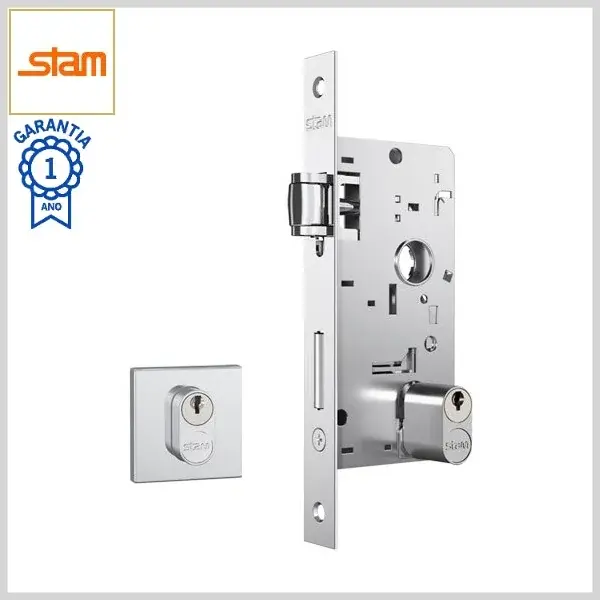 Fechadura Trinco Rolete Externa Standard 803 Broca40mm Chave Simples s/Maçaneta c/Roseta Inox Quadrada1 - Cromado - Stam