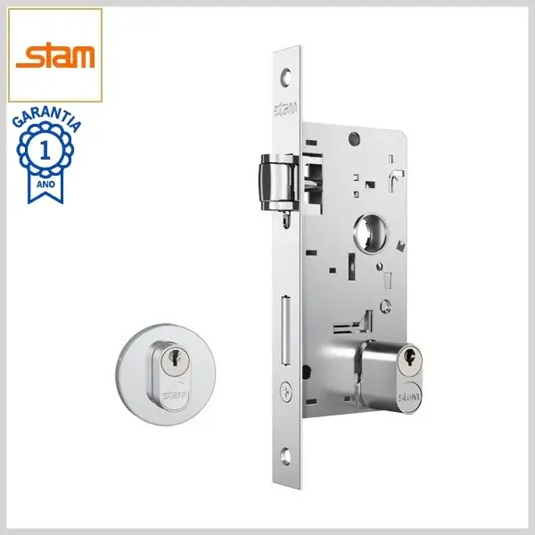 Fechadura Trinco Rolete Externa Standard 803 Broca40mm Chave Simples s/Maçaneta c/Roseta Inox Redonda - Cromado - Stam