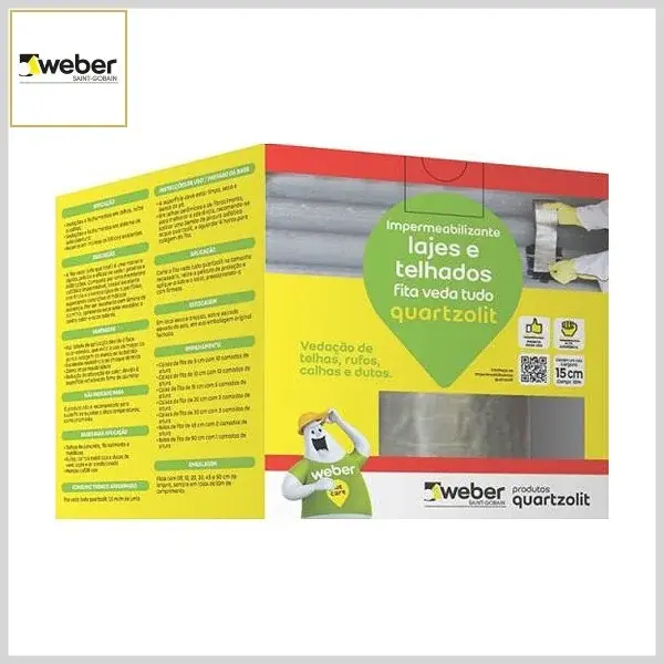 Fita veda tudo Quartzolit é uma fita autoadesiva composta por asfalto e película de alumínio flexível, protegida por uma película de Pvc removível quando da colagem aos substratos. É indicada para vedação de telhas metálicas, telhas de concreto ou fibrocimento, vedação de rufos e calhas metálicas, vedação de dutos de ventilação e de ar condicionado e para fechamento de sobreposições em sistemas de subcobertura.